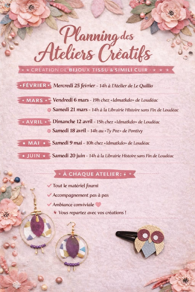 Il est possible que cet atelier se fasse à votre domicile selon le secteur géographique, des frais pourront être appliqués pour des déplacements de plus de 40 kms autour de LE QUILLIO.