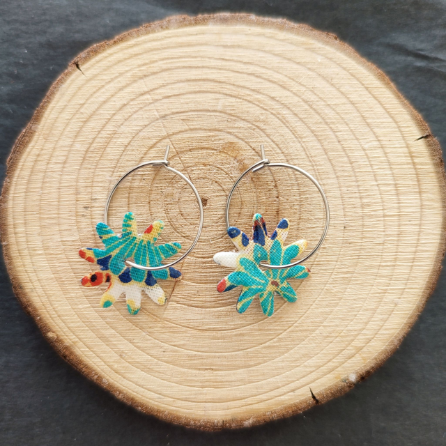 Ces boucles d'oreilles réalisées à la main à partir de chutes de tissu résinées, se positionnent sur une créole en acier inoxydable et sont interchangeables. Elles seront le cadeau parfait, unique et original que vous recherchez. Vous pourrez trouver d'autres modèles de fleur dans la boutique dans l'article "Fleurs en résine" Les tailles des créoles et des fleurs varient et vous trouverez ces informations dans chaque nom de produit.