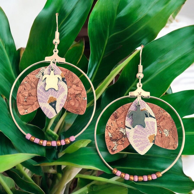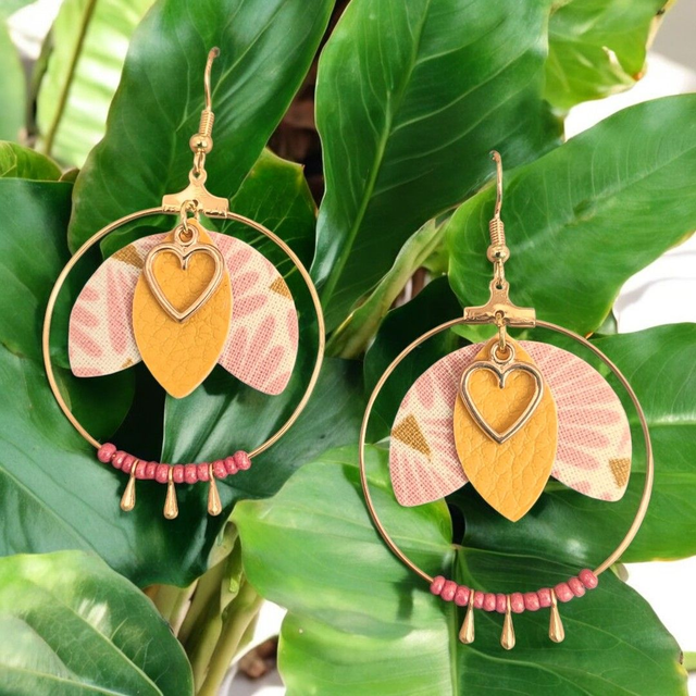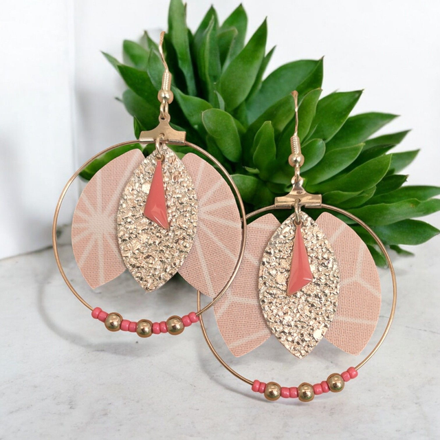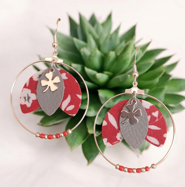 Réalisées à la main, toujours à partir de tissu et de simili cuir, ses anneaux mesurent 4cm et sont ornés de petites perles et breloques rappelant les couleurs du tissu.