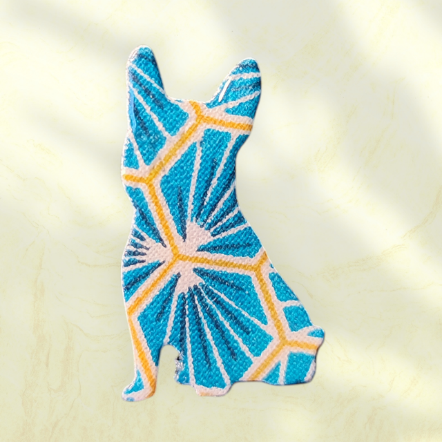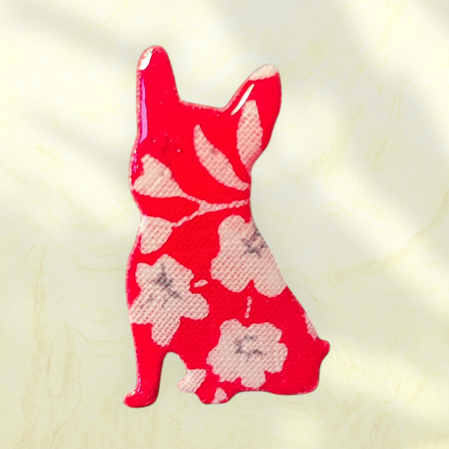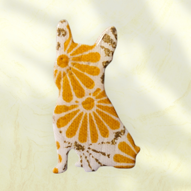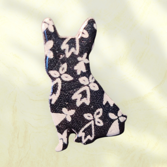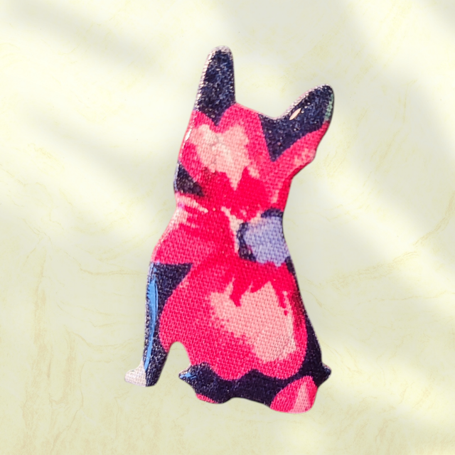 Réalisée à la main avec un tissu durci que je résine pour le rendre résistant, cette broche mesure 4 cm de haut et 2.5cm de large.
